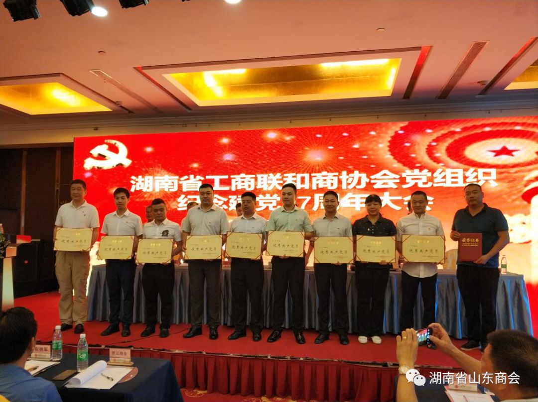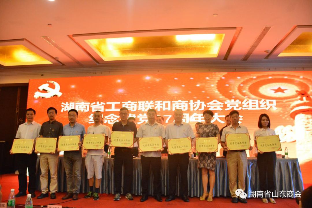 会上,省工商联党组成员、副主席杨广林同志宣读了《关于表彰“先进基层党组织”、“优秀共产党员”、“优秀党务工作者”的决定》,中共湖南省山东商会第一党支部被评为“先进基层党组织”、商会党委书记、会长李涛被评为“优秀党务工作者”,执行会长柳正明、理事白凌、会员李彦霖被评为“优秀共产党员”。