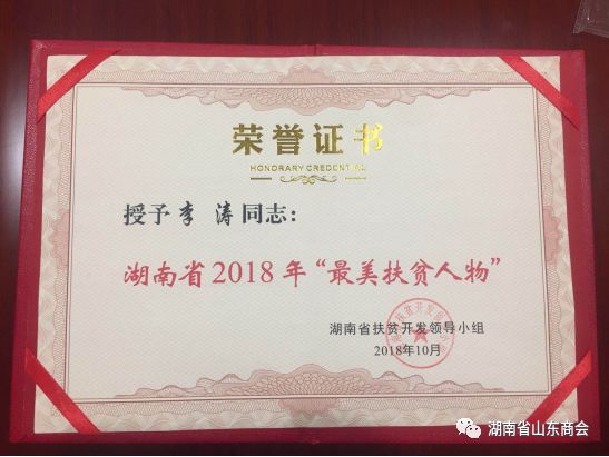 根据湘扶发【2018】12号文件《湖南省扶贫开发领导小组关于表彰湖南省2018年“最美扶贫人物”的决定》,湖南省山东商会党委书记、会长李涛荣获湖南省2018年“最美扶贫人物”。
