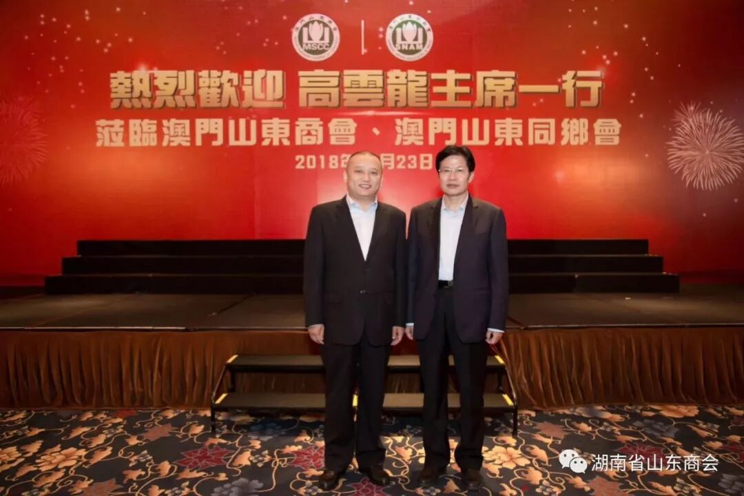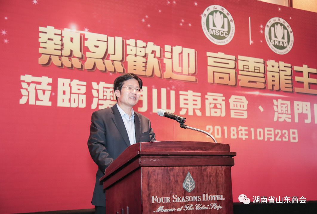 2018年10月23日上午,全国政协副主席、全国工商联主席高云龙一行14人在澳门参加澳门山东商会、澳门山东同乡会与商会代表及企业家进行了亲切交流。会议由澳门山东商会理事长张希华主持。澳门山东商会会长、澳门山东同乡会会长魏承波发表讲话。湖南省山东商会会长李涛等来自国内各省山东商会的会长一同参与。
