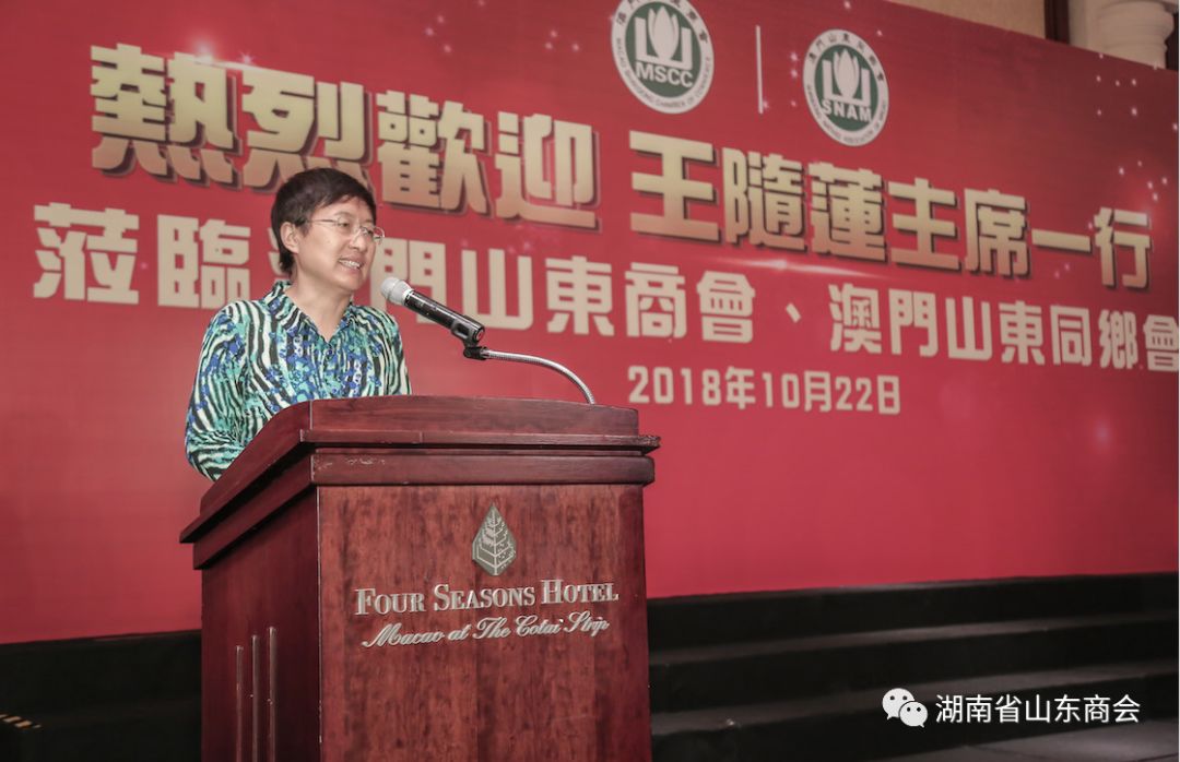 山东省工商联主席王随莲介绍了山东省近期的投资环境状况,以及省政府在招商引资政策上的改革举措。在解读各项信息和政策的同时,王随莲表示,希望远在澳门和全国各地发展的企业家们常回故乡,并在家乡投资建设,为山东家乡的发展作出贡献。