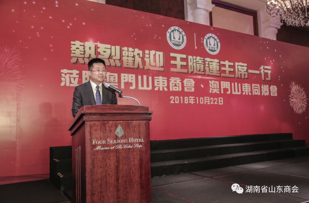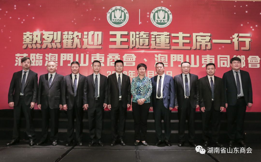 2018年10月22日,山东省工商联主席王随莲、山东省工商联副主席孙美菊、山东省工商联秘书长于玲、山东省工商联副主席尚吉永、山东省工商联副主席刘爱丽、山东省总商会副会长魏建国等一行10人来到澳门参加澳门山东商会、澳门山东同乡会指导工作,湖南省山东商会会长李涛等部分内地省级山东商会的会长一同参与交流。