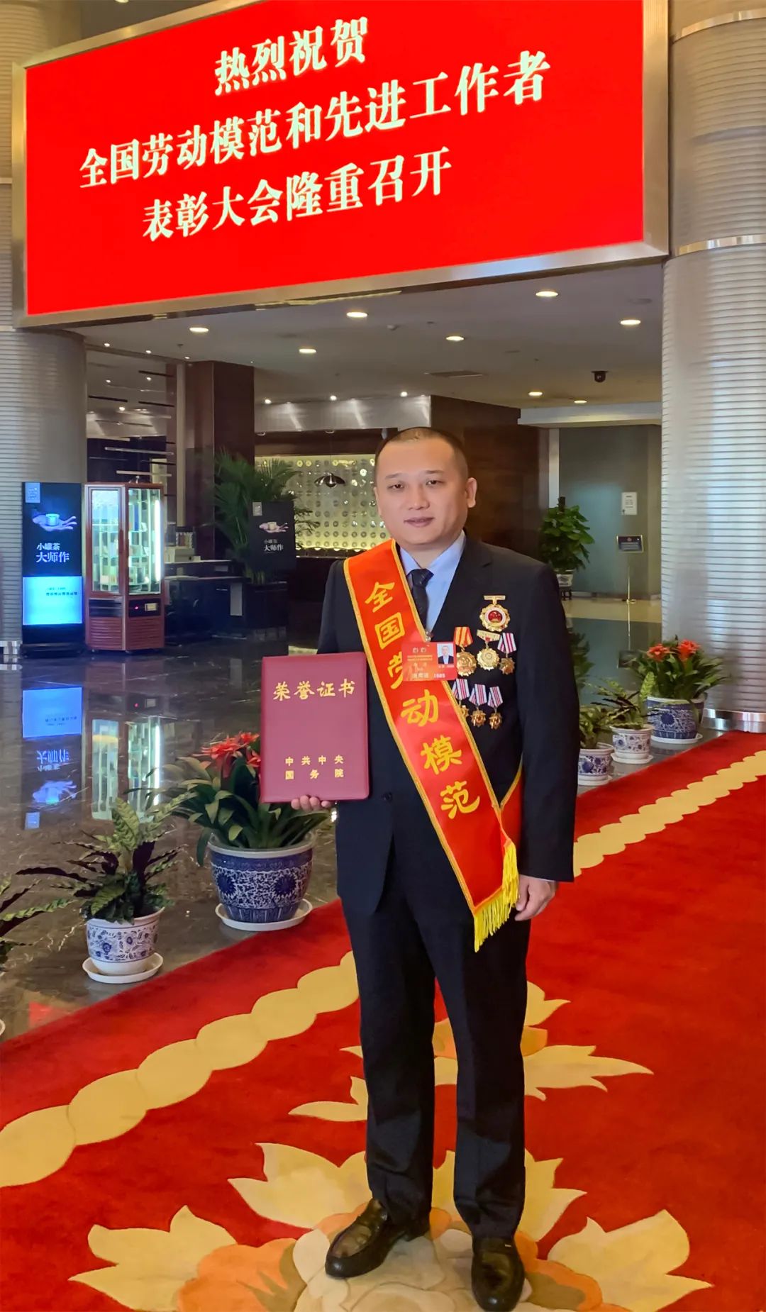 在欢快的乐曲声中,全国劳动模范和先进工作者代表依次登上主席台,习近平等为他们颁发荣誉证书。
